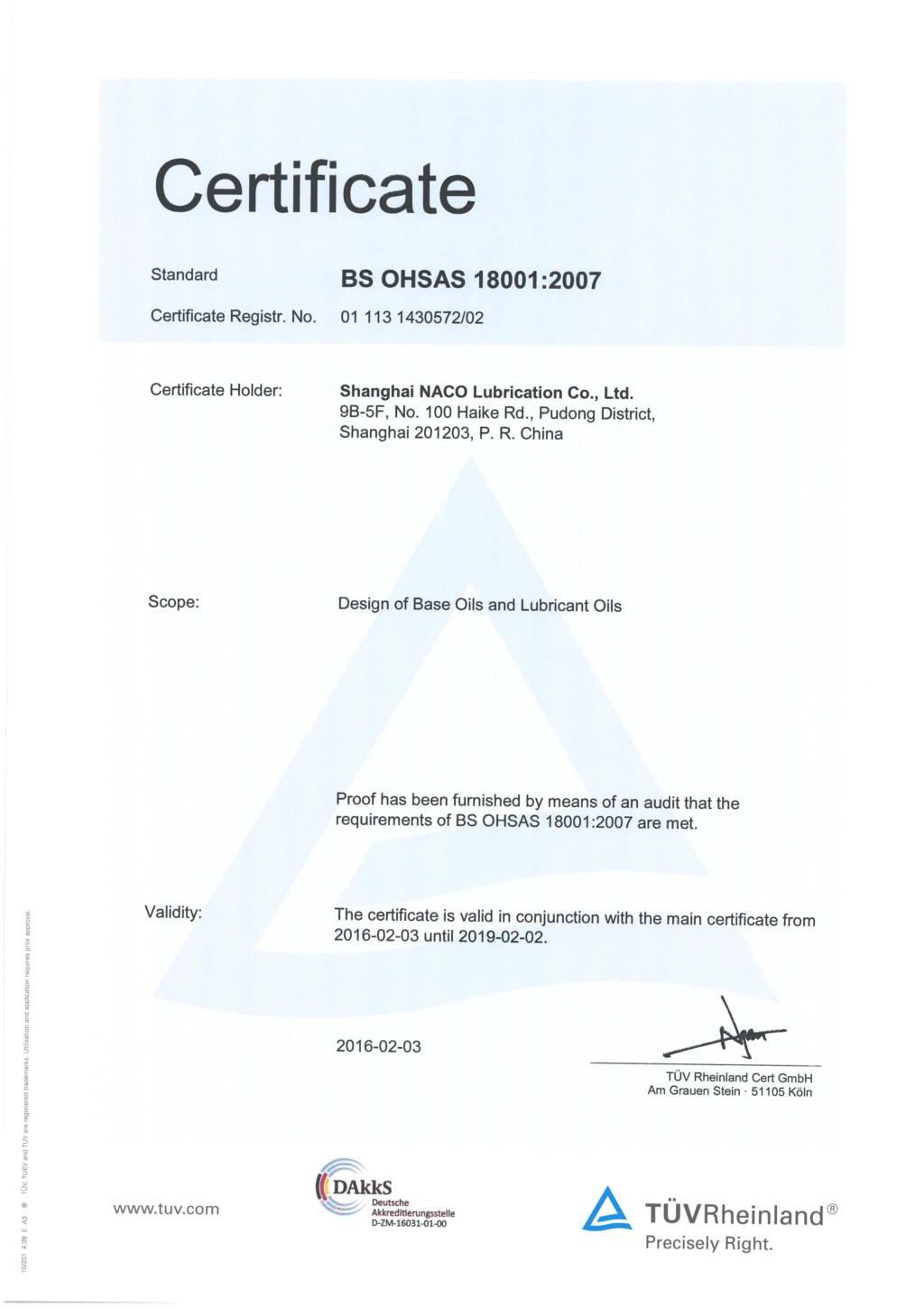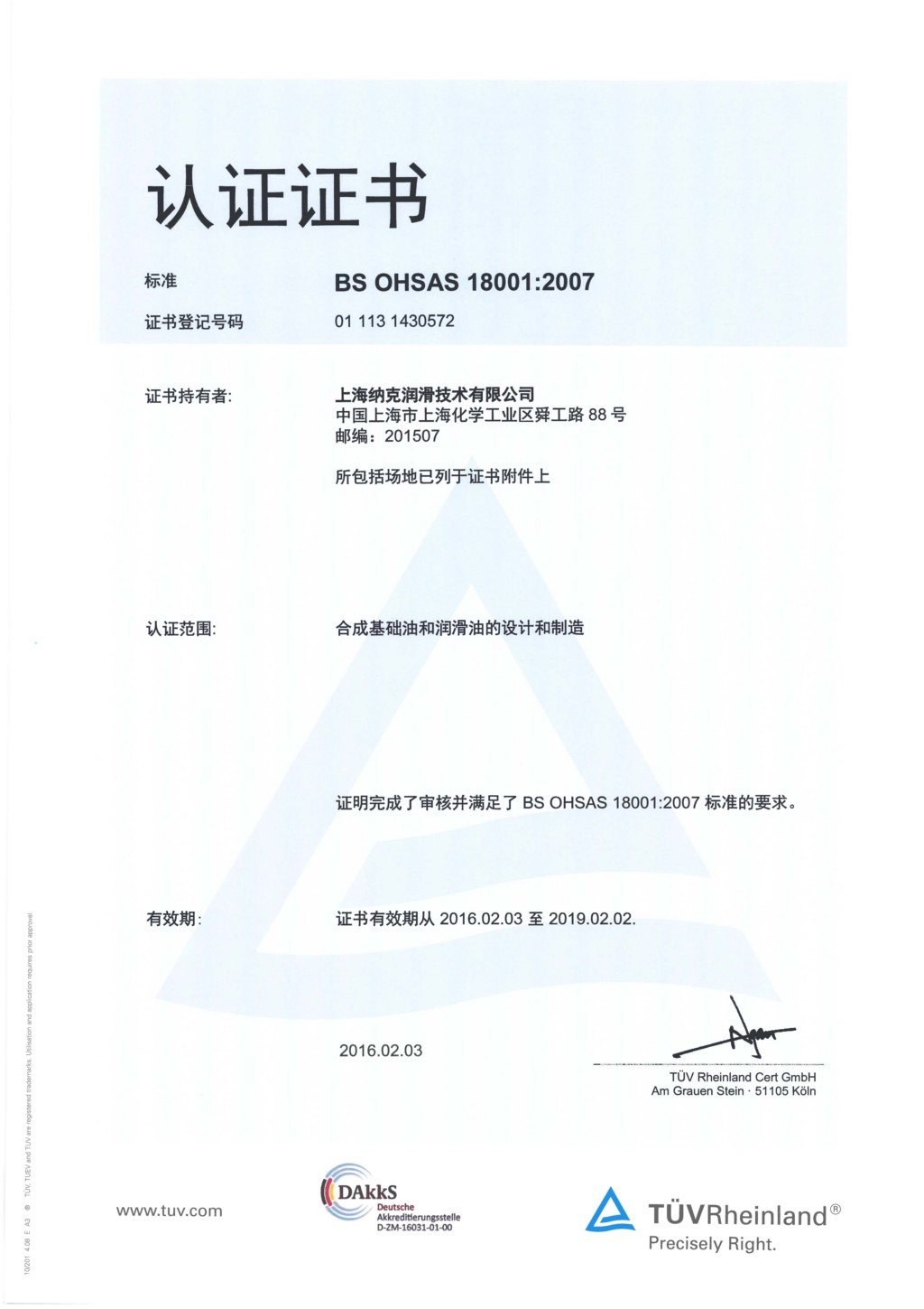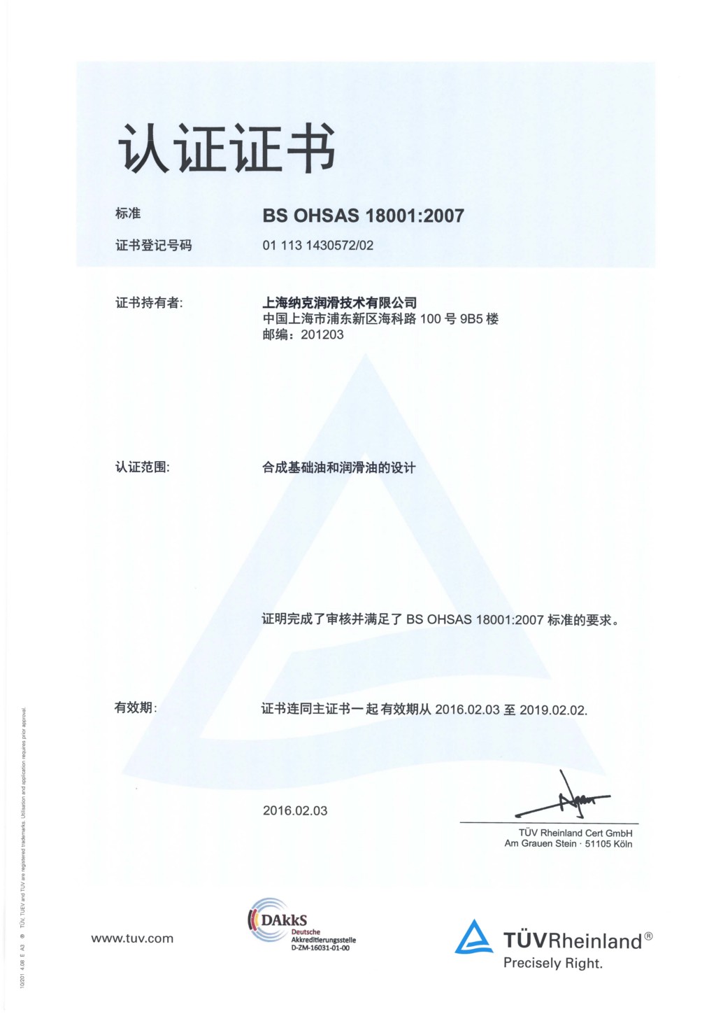 2016年納克潤滑獲得德國萊茵TUV頒發的IS018001:2007質量體系認證。