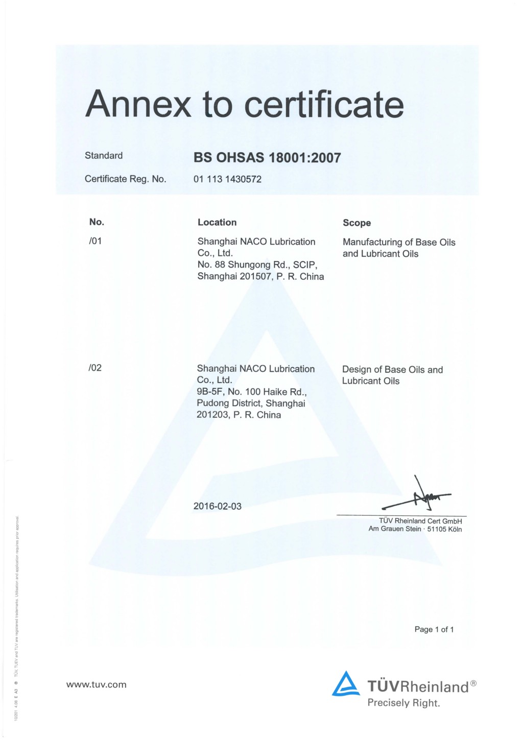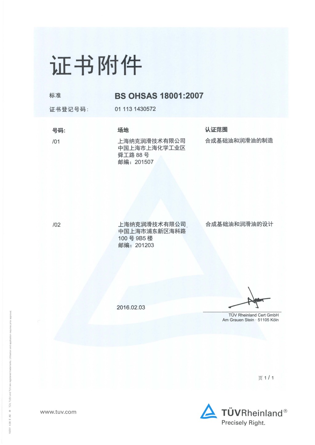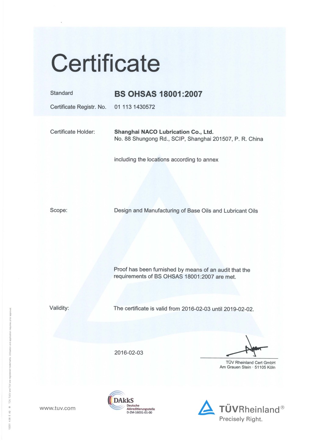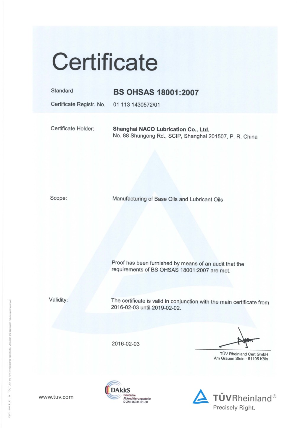 2016年納克潤滑獲得德國萊茵TUV頒發的IS018001:2007質量體系認證。