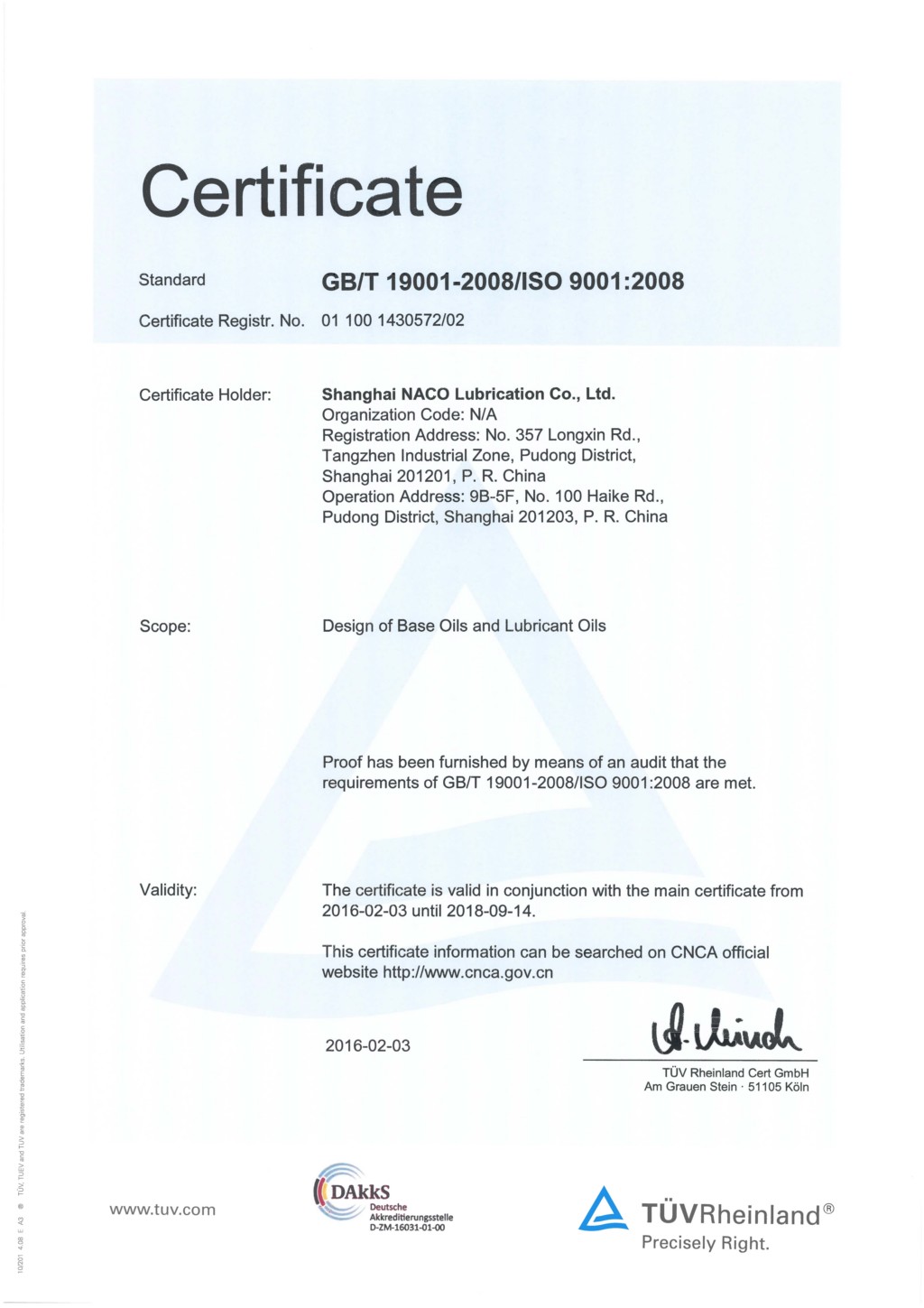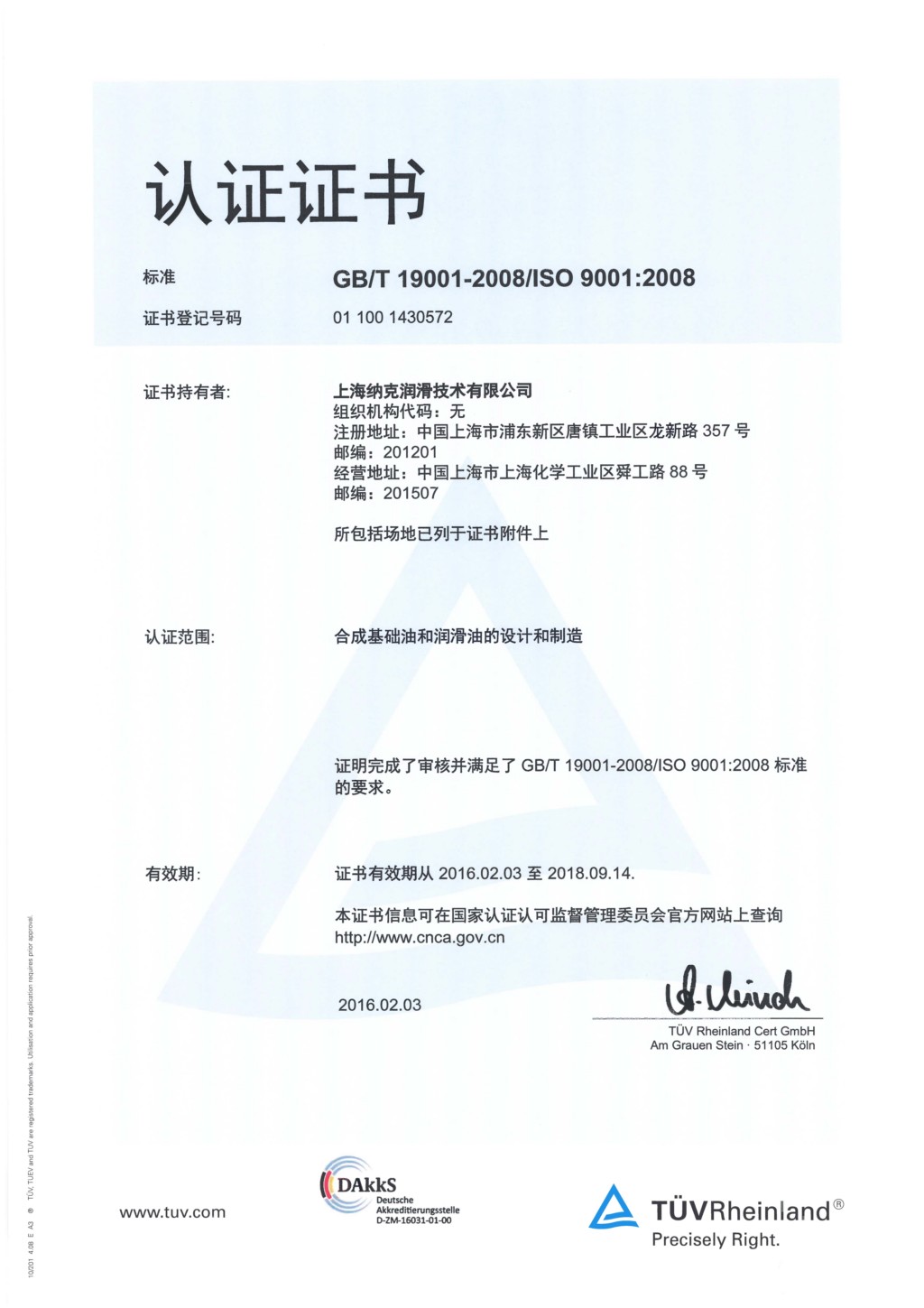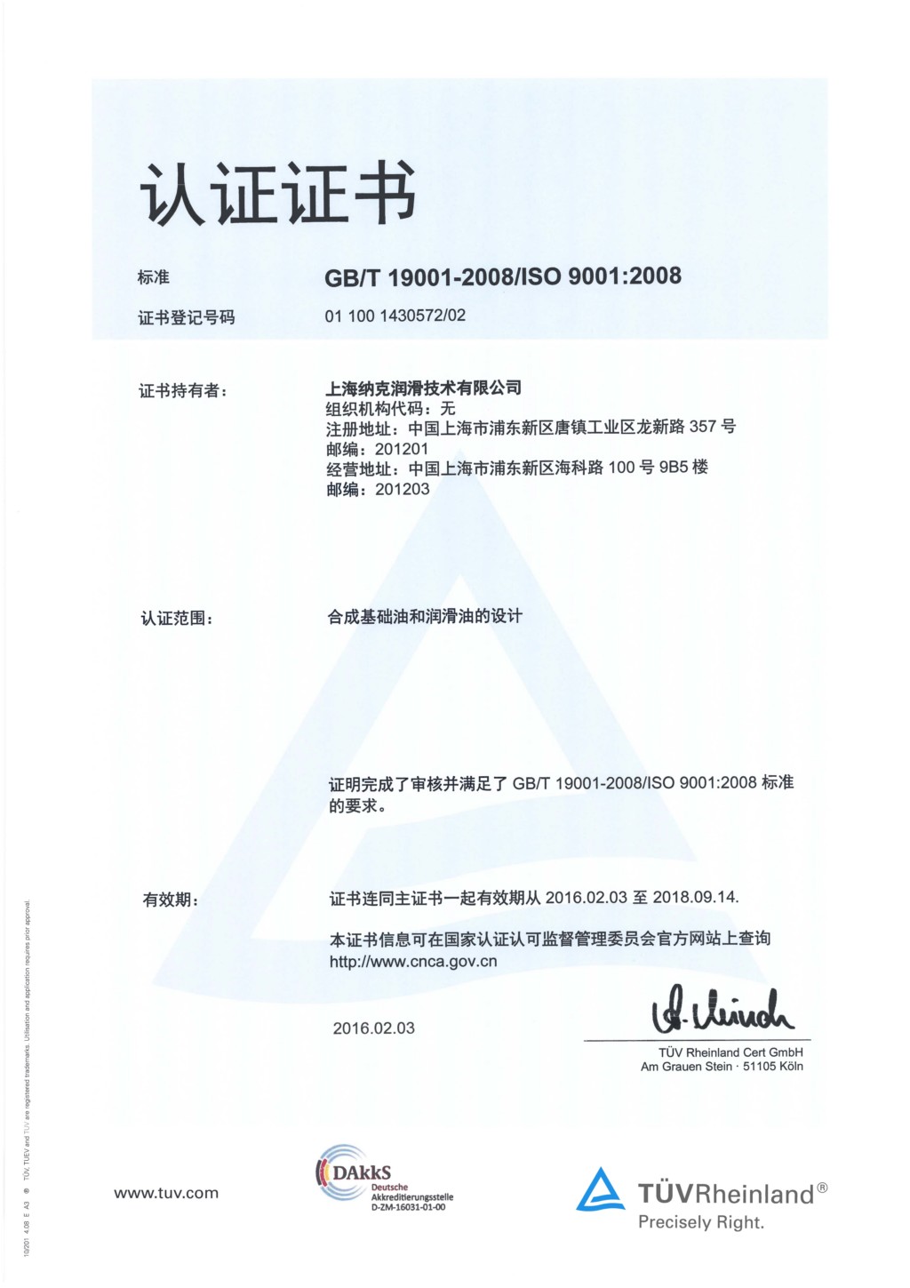 2016年納克潤滑獲得德國萊茵TUV頒發的ISO9001:2008質量體系認證。