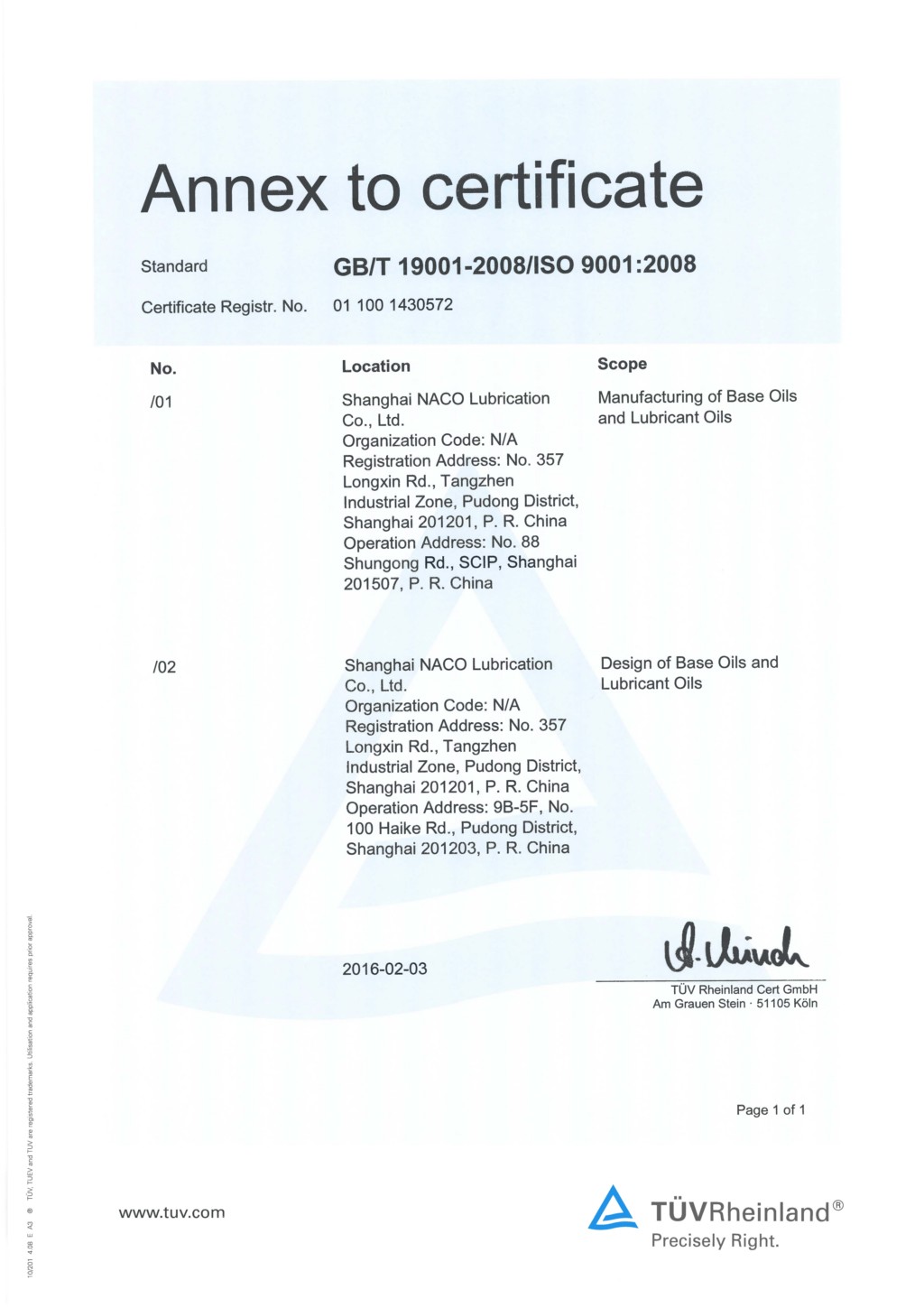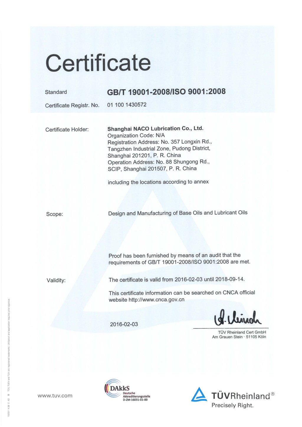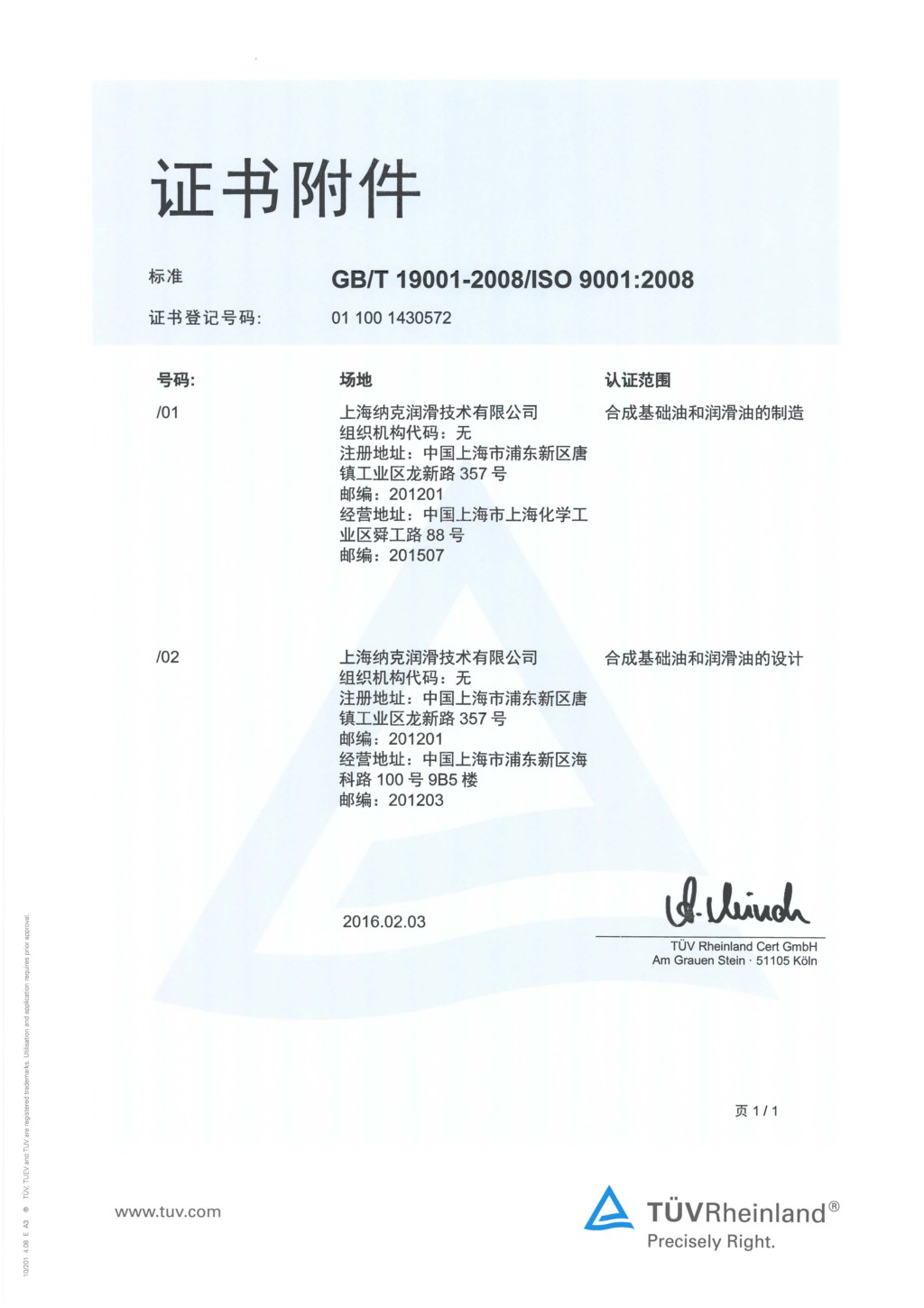 2016年納克潤滑獲得德國萊茵TUV頒發的ISO9001:2008質量體系認證。
