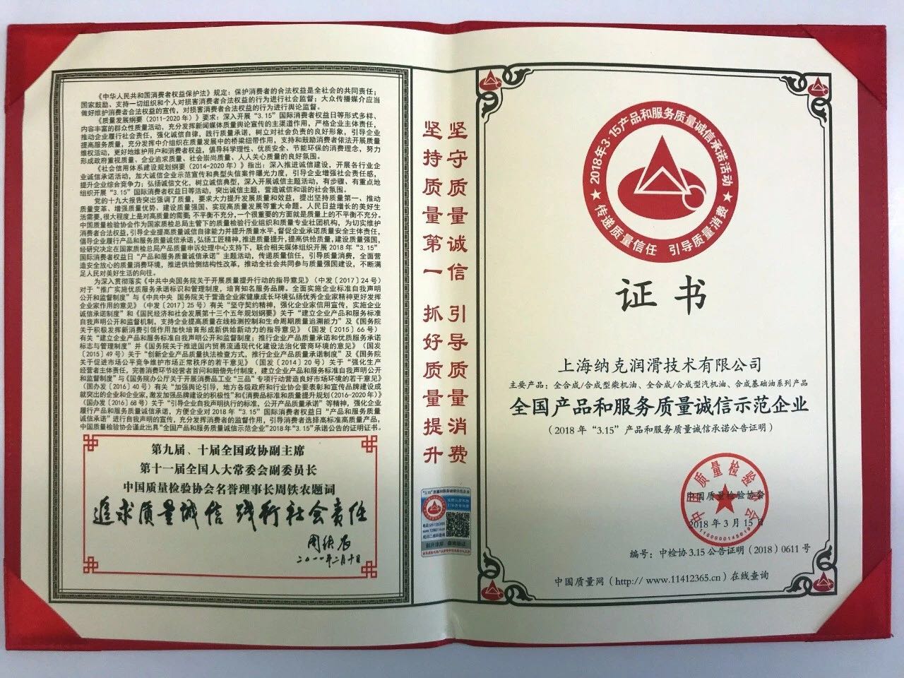 在今年的3.15國際消費者權益日,上海納克被中國質量檢驗協會授予“全國產品和服務質量誠信示范企業”、“全國潤滑油行業質量領先品牌”榮譽證書。