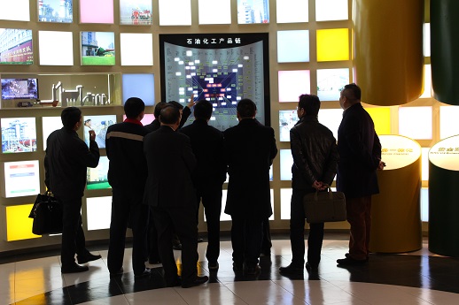 吳董為王市長(zhǎng)一行講解化工區(qū)展示廳LED屏幕上的“石油化工產(chǎn)品鏈”并進(jìn)行交流