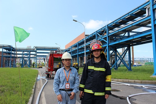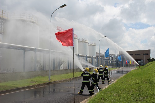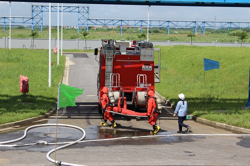 實(shí)戰(zhàn)演習(xí)按照預(yù)定方案緊張有序地進(jìn)行。9點(diǎn)30分事故現(xiàn)場(chǎng)發(fā)生辛烯罐著火,調(diào)和巡檢罐區(qū)員工緊急呼叫調(diào)和班長(zhǎng)及中控室救援。總指揮郭總接到中控通知后立即下達(dá)命令,搶險(xiǎn)救援隊(duì)、搶修組、調(diào)和車間負(fù)責(zé)人、救護(hù)組、物資救援隊(duì)和微型消防隊(duì)迅速到位,趕往現(xiàn)場(chǎng)。緊接著,通知外部消防支隊(duì)前來(lái)滅火,南北門衛(wèi)做好安保及警戒工作,將傷者救出送往急救中心。最后,搶修隊(duì)修好泄漏點(diǎn),現(xiàn)場(chǎng)火警消除,各組進(jìn)行后期清掃。